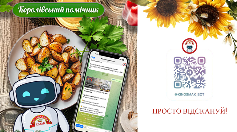 TM “Korolivskyi Smak” invites you to immerse yourself in the world of delicious and exquisite dishes! To make the cooking process even more convenient, we have developed a special bot in Telegram – “Royal Cook”. It will become your ideal assistant for every day, help you quickly find the perfect recipes and tell you what ingredients you will need.
