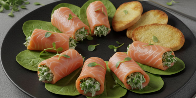 Подача: Викладіть на велику тарілку свіже листя салату, зверху розмістіть охолоджені рулетики. Подавайте разом із теплими хрусткими тостами.