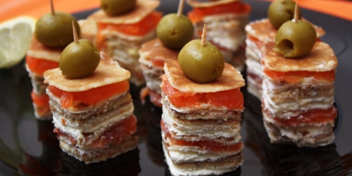 Викладаємо шари в наступній послідовності: листя салату, креветки, майонез, сир, креветки, майонез, сухарики, сир, майонез.