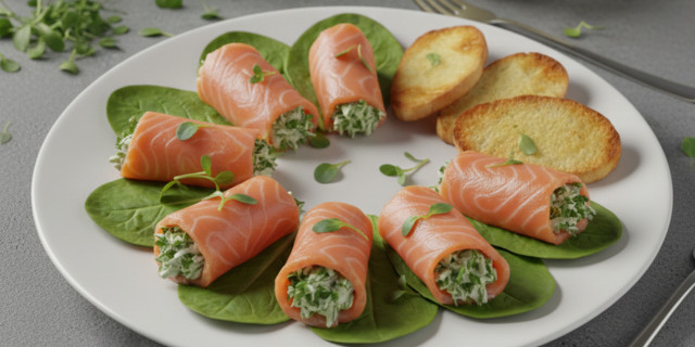 Forming the rolls: Spread thin slices of salmon on a work surface. Grease each piece with the resulting creamy mixture. Carefully wrap the fish in tight rolls.