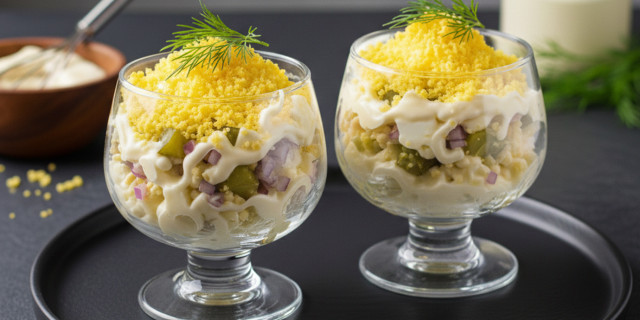 Chopping: Cut 4 eggs into neat slices (quarters or circles). Leave one piece for decoration. Cut the pickled cucumber into thin slices or small cubes. Cut the onion as finely as possible so that it gives off aroma, but does not interrupt the texture.