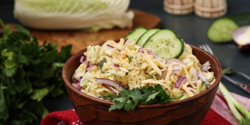 Усі передбачені рецептом продукти шинкують ломтиками, заправляють майонезом з додаванням гірчиці.